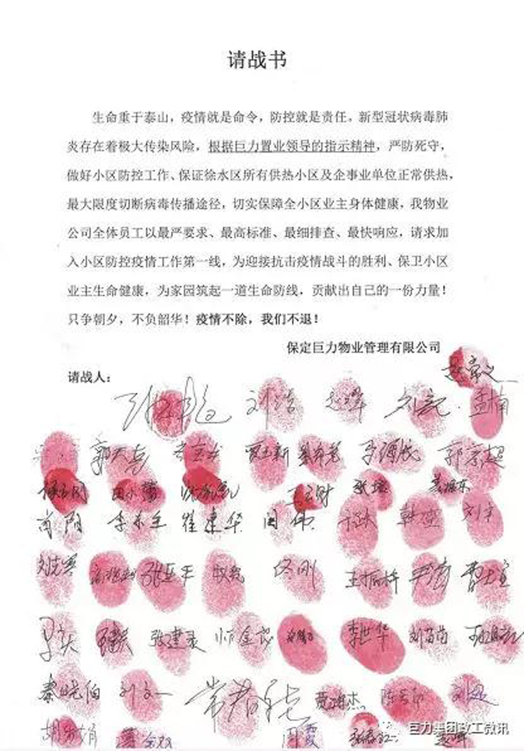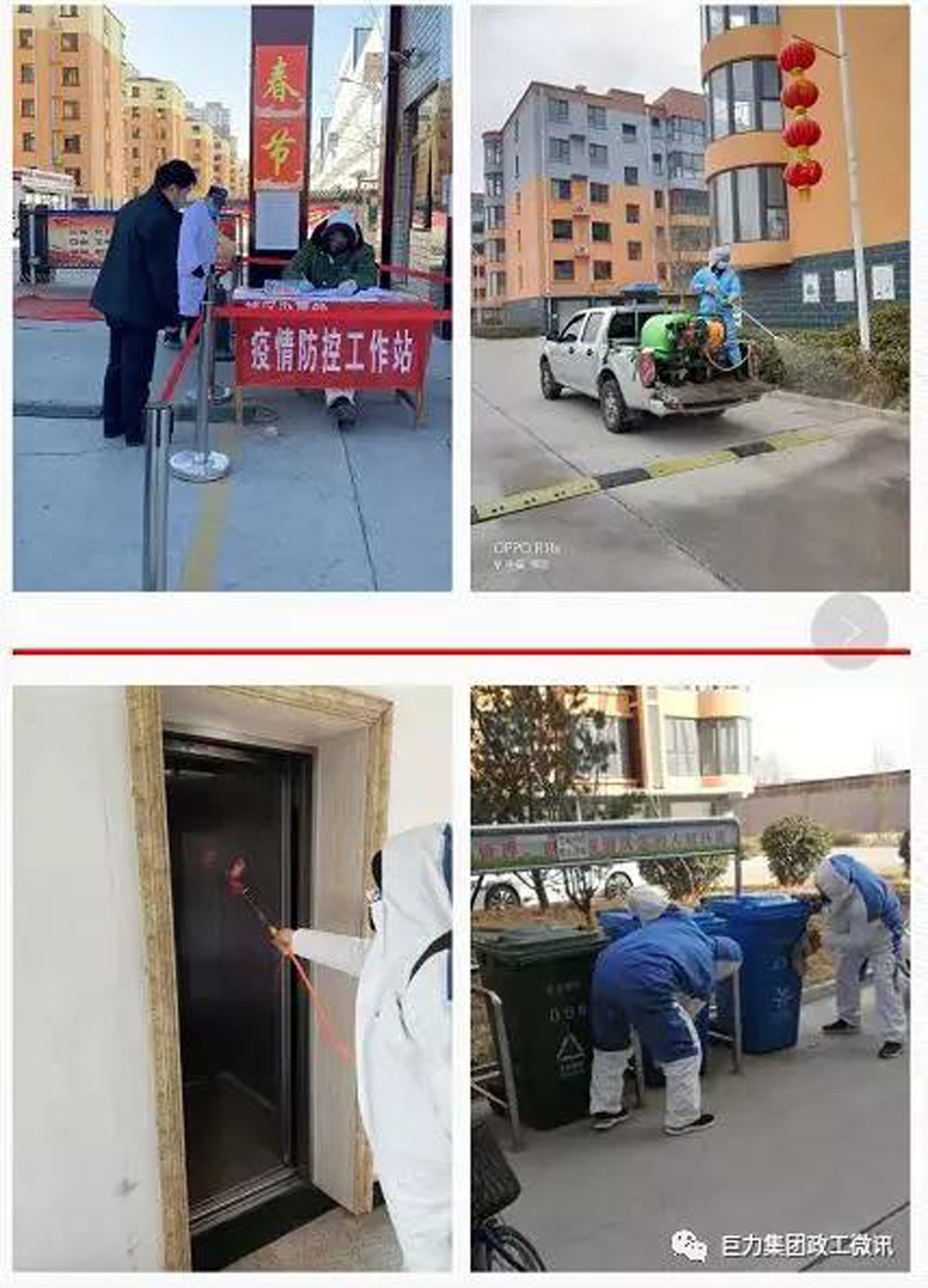 一是黨委全力迎戰(zhàn),自疫情發(fā)生以來,黨委高度重視,黨委書記、董事長楊建忠同志發(fā)岀了“我是黨員,做一名戰(zhàn)士”的動員令,要求公司全體黨員深入貫徹落實、全面投入開展疫情防控。成立了由黨委書記掛帥的巨力集團疫情防控領(lǐng)導(dǎo)小組,制發(fā)了疫情防控手冊,通過微信等形式下發(fā)到每一位員工手里,嚴(yán)格按照防疫措施進行控制,打造疫情防控“防火墻”,構(gòu)筑起了堅強的戰(zhàn)“疫”堡壘。二是黨員挺身請戰(zhàn),巨力置業(yè)公司黨支部迅速啟動應(yīng)急預(yù)案,同步做好供熱和疫情防控工作。“疫情不除,我們不退!”黨員骨干帶領(lǐng)90多名一線物業(yè)人員,在《戰(zhàn)疫請戰(zhàn)書》上蓋了紅手印。他們對重點部位重點人員進行全時全方位消毒,哪怕消毒水熏紅了眼睛、嗆干了喉嚨也堅守不退。三是黨員堅守鏖戰(zhàn),節(jié)日期間,集中供熱人員放棄休假,24小時待命,堅持每日排查,了解業(yè)主最新狀況,尤其是在時間緊、任務(wù)重的情況下,巨力能源公司克服各種不利于施工的條件,雪中送炭,及時為機械廠小區(qū)開通了供熱管道,為居民帶來了溫暖。截至目前,徐水區(qū)所有企事業(yè)單位、醫(yī)院及居民家庭2萬多戶供熱安全穩(wěn)定,社區(qū)居民自發(fā)送來錦旗表達感謝。